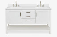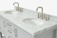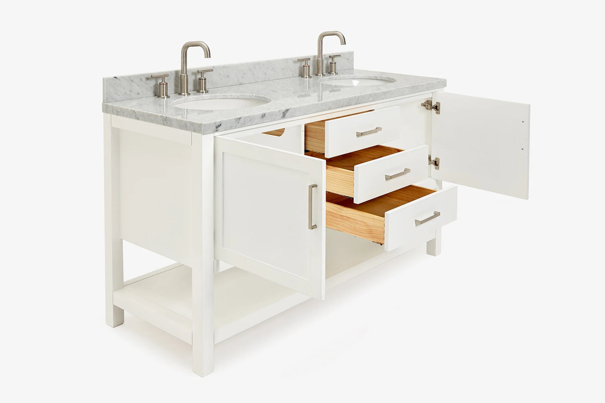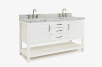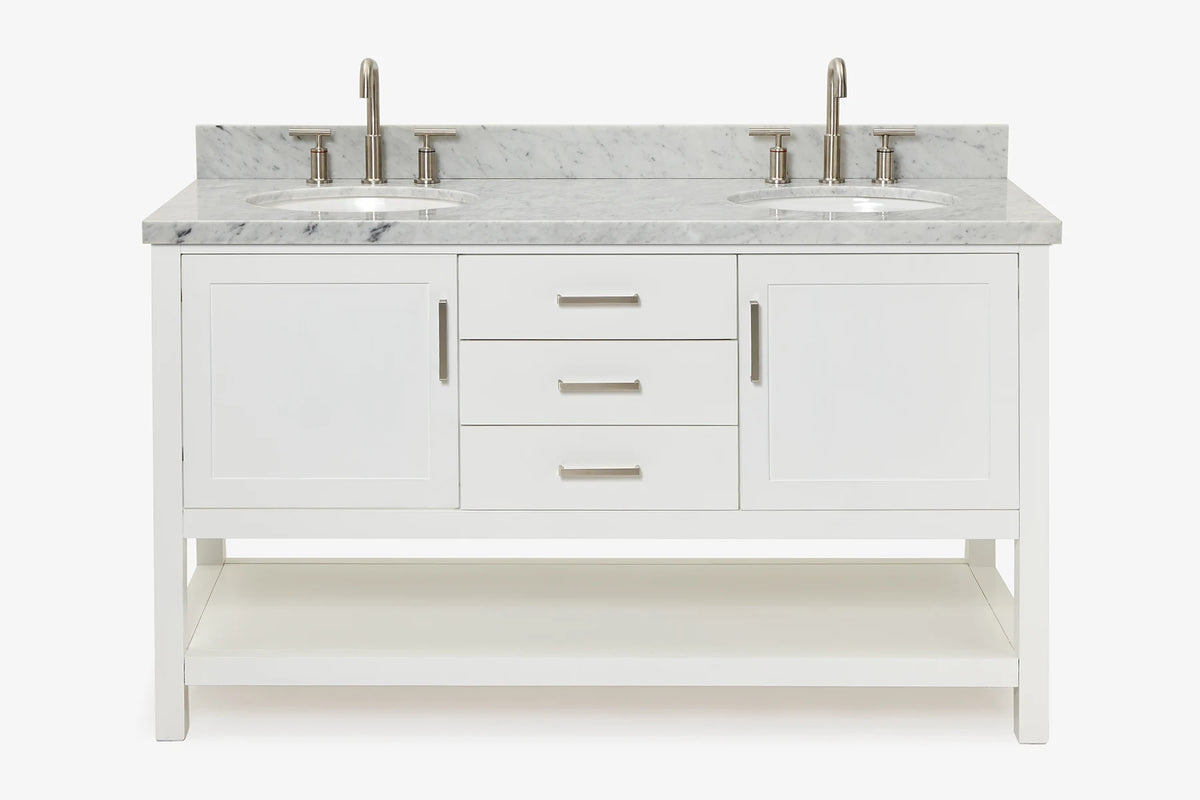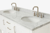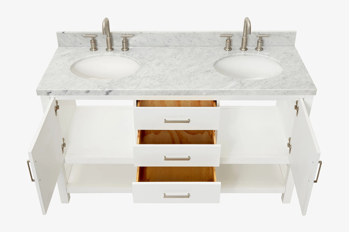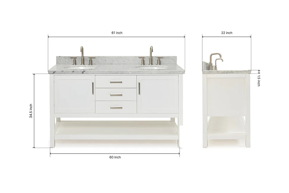 Cabinet ColorWhiteCabinet MaterialWoodCounter Top TypeItalian Carrara MarbleCounter Top Sink MountUndermountCounter Top Faucet Wide Spread8 in. WidespreadNumber of Sinks2Sink/Basin ColorWhiteSink MaterialPorcelainSink/Basin ShapeOvalSink OffsetDoubleDoors2Drawers3Handles/Knobs FinishBrushed NickelVanity TypeFreestandingWood SpeciesRubberStyleTransitionalCare instructionTo clean the vanity base cabinet, use a soft damp cloth to wipe off dirt and dust; follow with a dry cloth. Do not apply abrasives or harsh cleaners Clean the top frequently with a clean, soft, damp cloth; use a mild liquid detergent and warm water.Included ComponentsFully assembled base cabinet, countertop with matching backsplash, sink(s)Countertop Edge (inch)1.5
