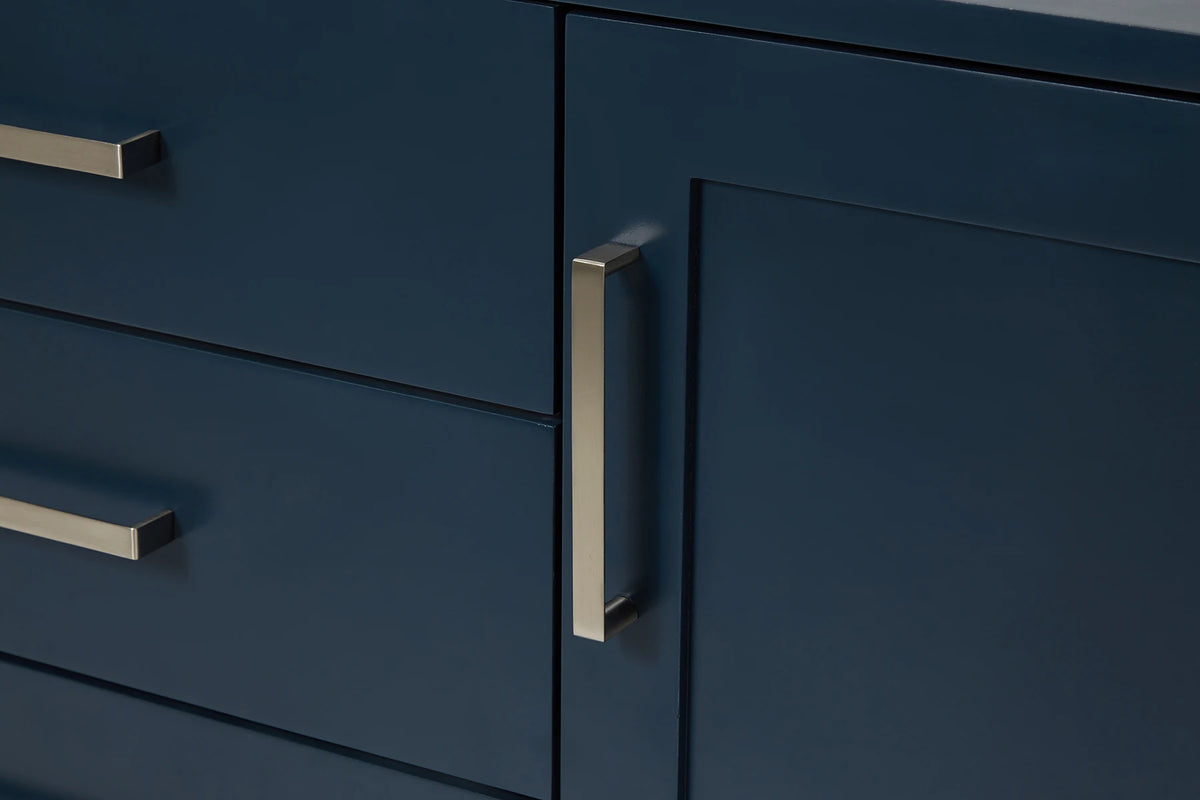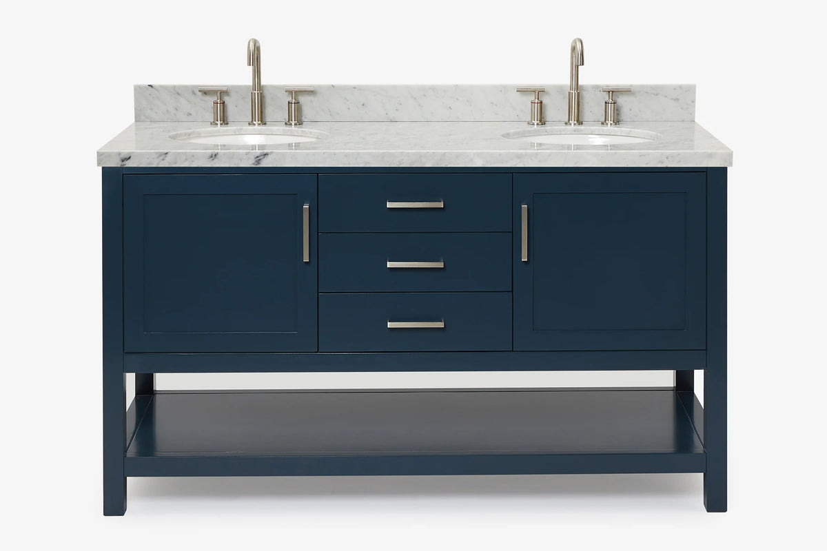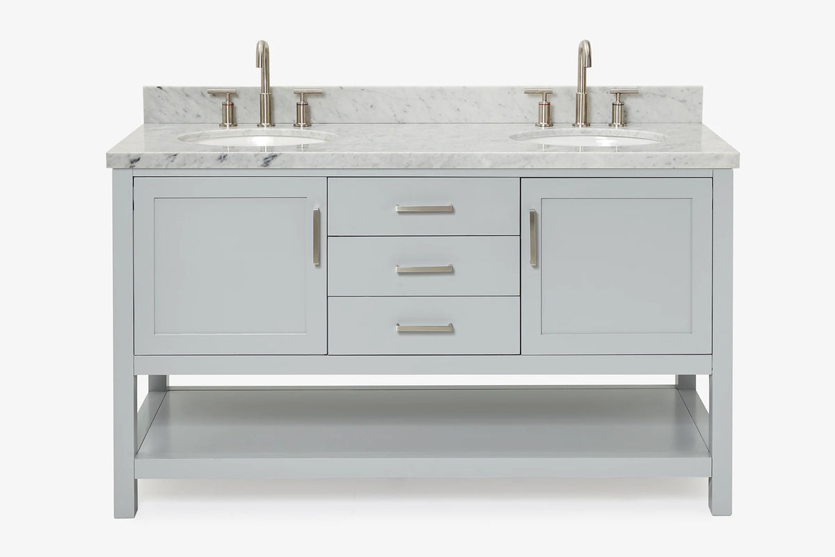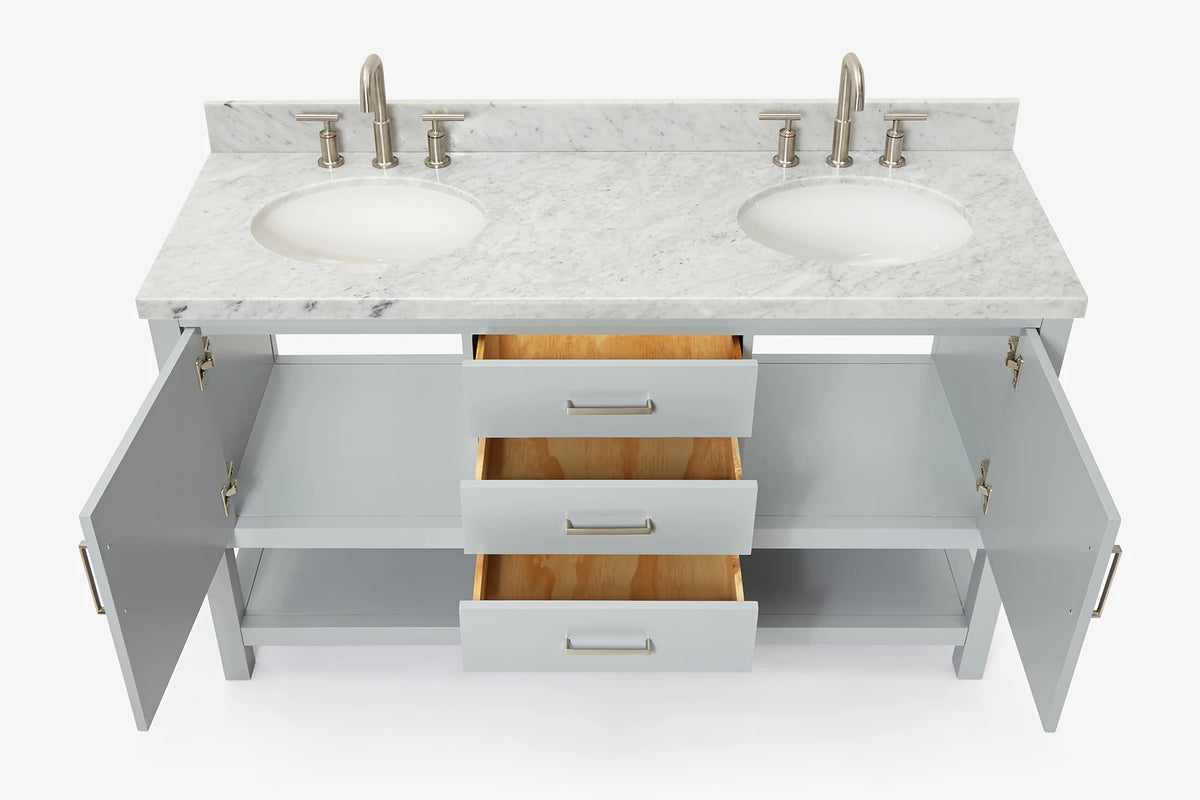 Cabinet ColorWhiteCabinet MaterialWoodCounter Top TypeItalian Carrara MarbleCounter Top Sink MountUndermountCounter Top Faucet Wide Spread8 in. WidespreadNumber of Sinks2Sink/Basin ColorWhiteSink MaterialPorcelainSink/Basin ShapeOvalSink OffsetDoubleDoors2Drawers3Handles/Knobs FinishBrushed NickelVanity TypeFreestandingWood SpeciesRubberStyleTransitionalCare instructionTo clean the vanity base cabinet, use a soft damp cloth to wipe off dirt and dust; follow with a dry cloth. Do not apply abrasives or harsh cleaners Clean the top frequently with a clean, soft, damp cloth; use a mild liquid detergent and warm water.Included ComponentsFully assembled base cabinet, countertop with matching backsplash, sink(s)Countertop Edge (inch)1.5