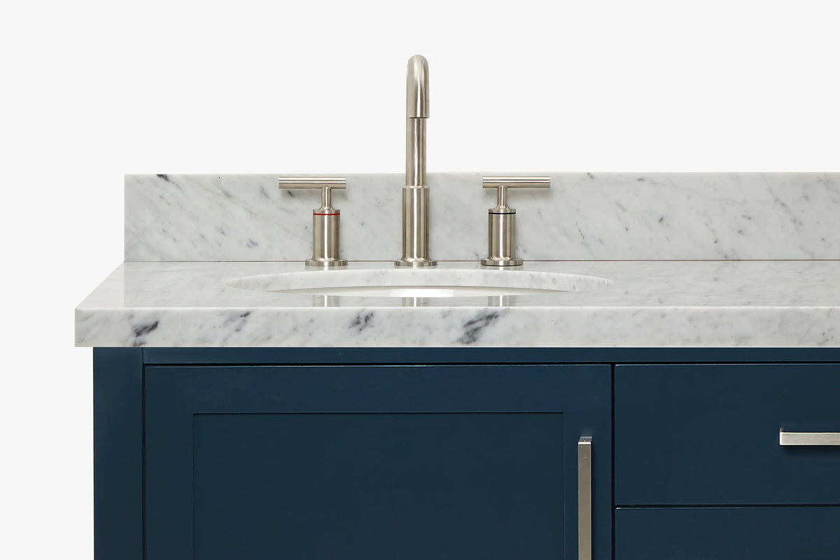 - Italian Carrara White Marble countertop with 1.5″ thick miter edge. 4″ backsplash included