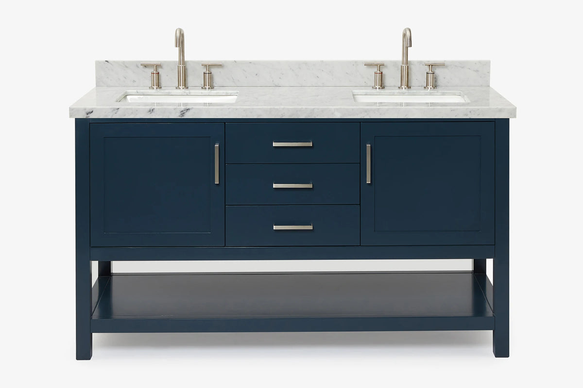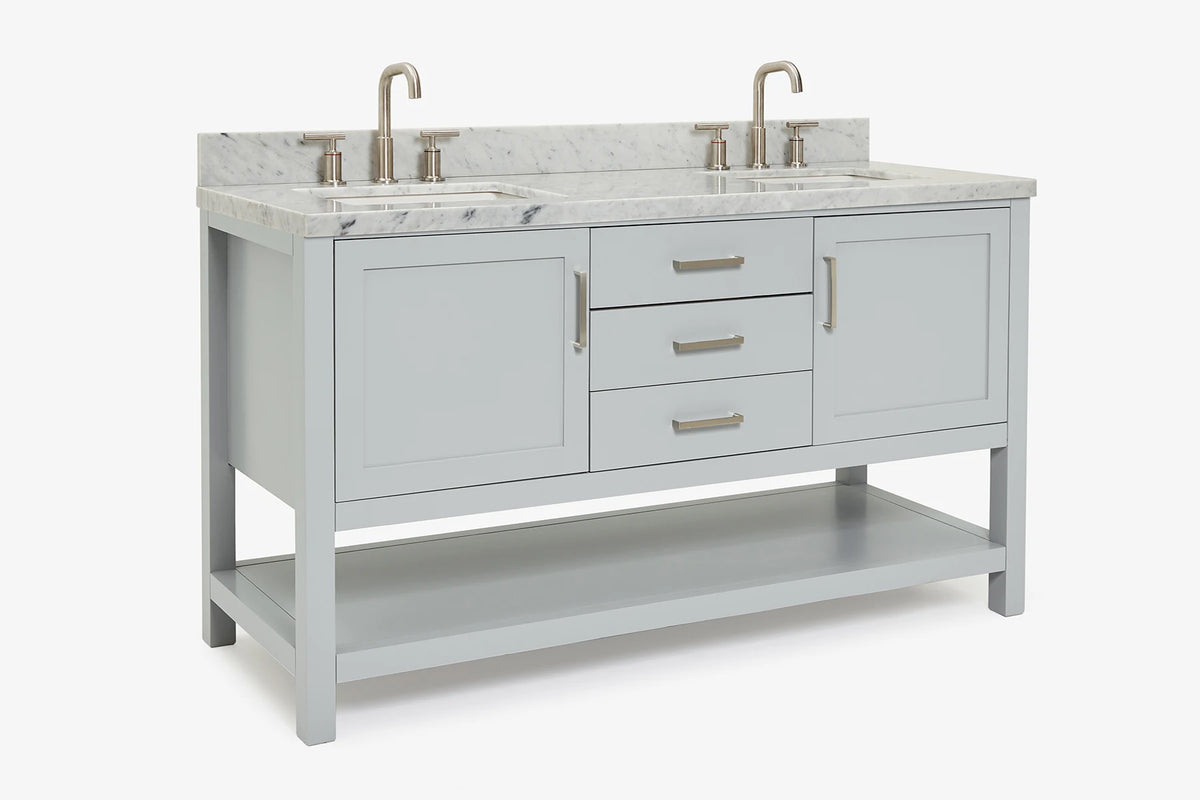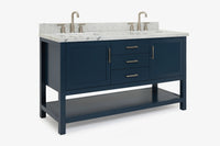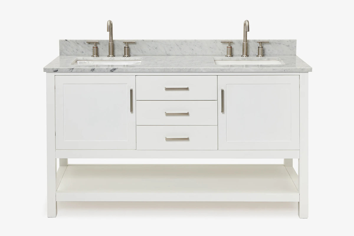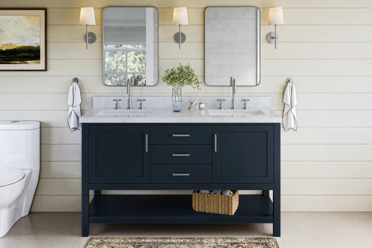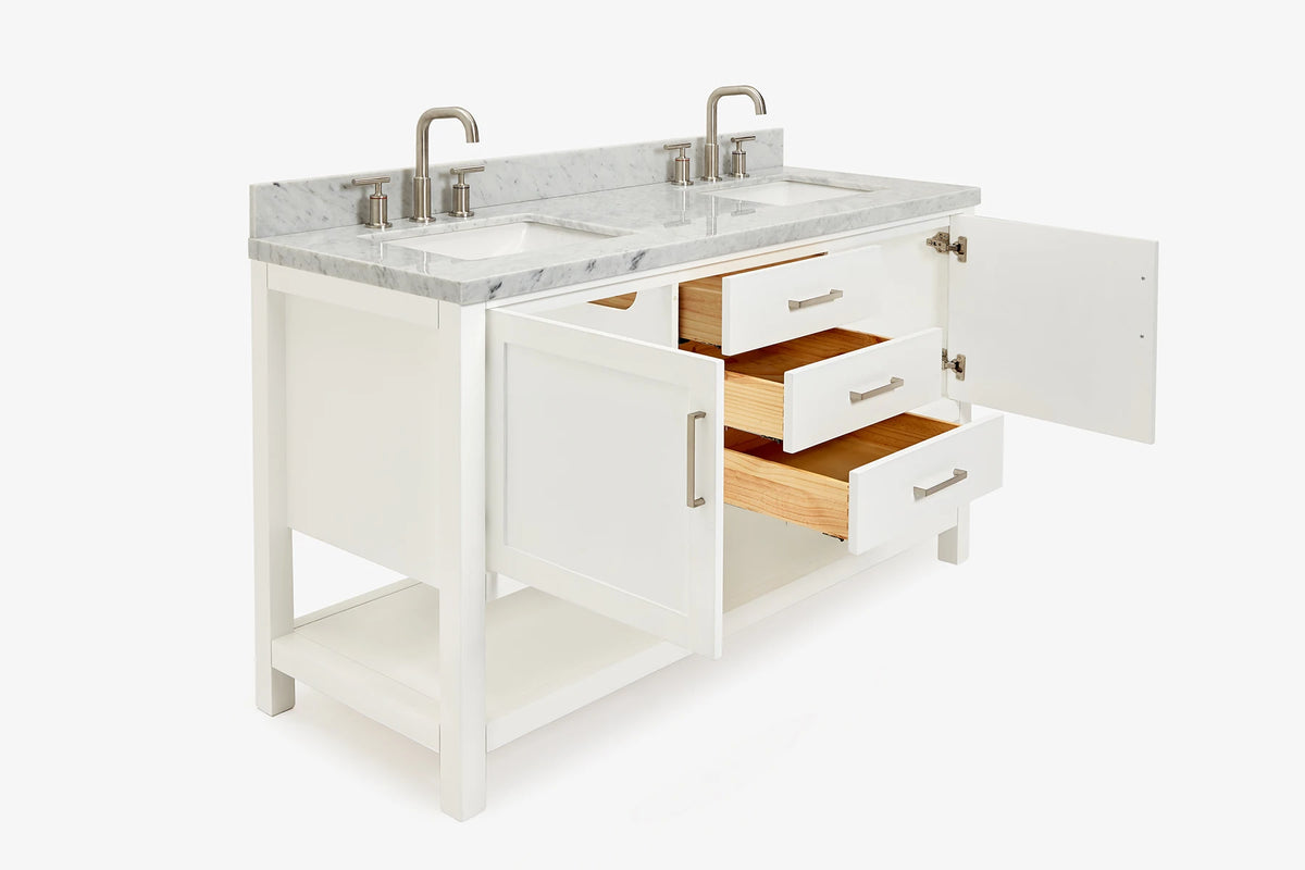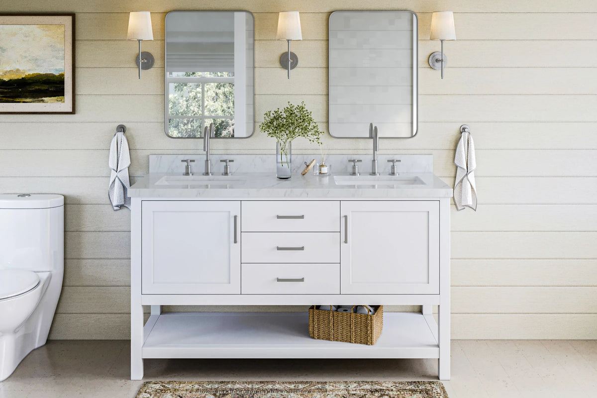 Bayhill collection from ARIEL Bath takes a farmhouse inspired open bottom shelf is ideal for stashing towels, toiletries and baskets, with hidden self-levelling feet accommodating uneven surfaces. Its beautiful design is complemented by soft-closing drawers & doors with premium Italian Carrara marble/ White quartz countertop. Easy to install and built to last, the Bayhill vanity is the easy answer to any of your bathroom remodeling.