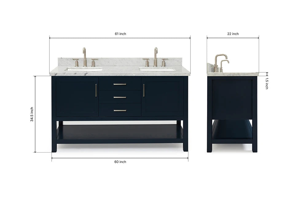 Overall61"W x 22"D x 36"HWeight (Lbs)287Cabinet Dimensions60″W x 34.5″H x 21.5″LCountertop Dimensions61″W x 1.5″H x 22″LSink Dimensions15.13" L x 20.25" W x 7.5" HSmall Drawer Interior17.5"W x 16.5"D x 4"HFaucet Hole Spacing8 inchShipping Length32Shipping Width66Shipping Height42Shipping Weight370