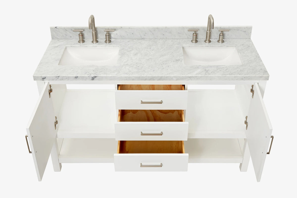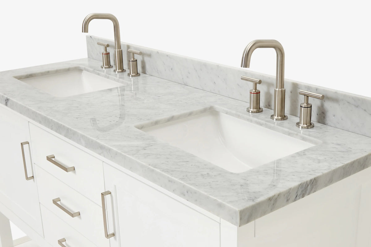 Cabinet ColorWhiteCabinet MaterialWoodCounter Top TypeItalian Carrara MarbleCounter Top Sink MountUndermountCounter Top Faucet Wide Spread8 in. WidespreadNumber of Sinks2Sink/Basin ColorWhiteSink MaterialPorcelainSink/Basin ShapeRectangleSink OffsetDoubleDoors2Drawers3Handles/Knobs FinishBrushed NickelVanity TypeFreestandingWood SpeciesRubberStyleTransitionalCare instructionTo clean the vanity base cabinet, use a soft damp cloth to wipe off dirt and dust; follow with a dry cloth. Do not apply abrasives or harsh cleaners Clean the top frequently with a clean, soft, damp cloth; use a mild liquid detergent and warm water.Included ComponentsFully assembled base cabinet, countertop with matching backsplash, sink(s)Countertop Edge (inch)1.5