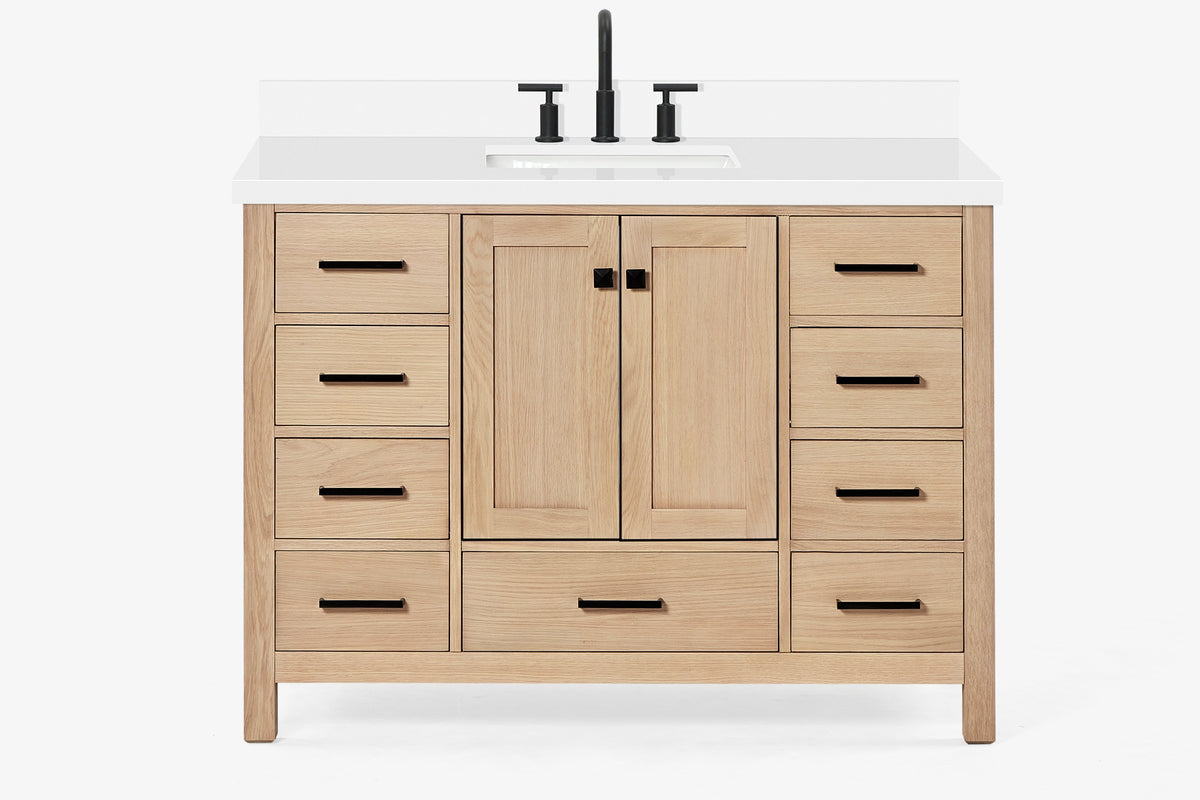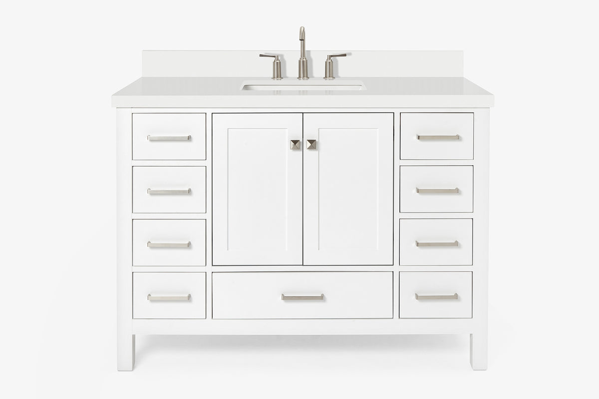 • Pure White Quartz countertop with 1.5" thick miter edge. 4" backsplash included