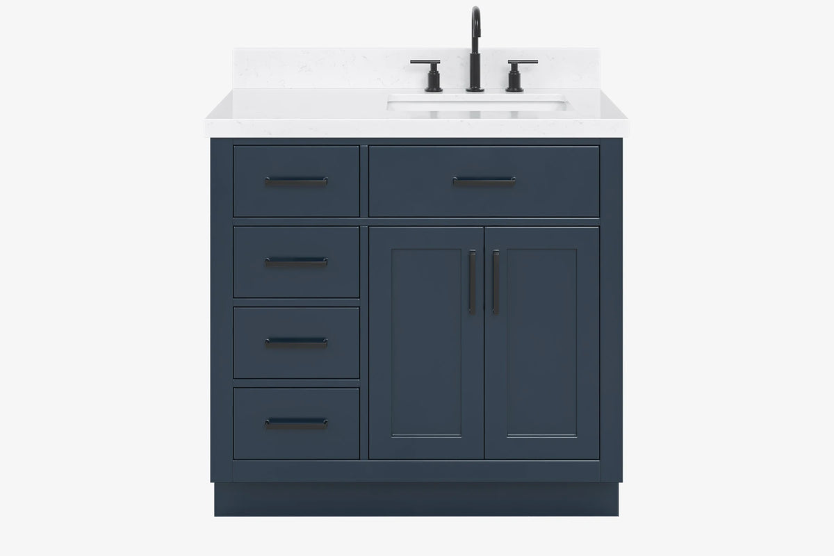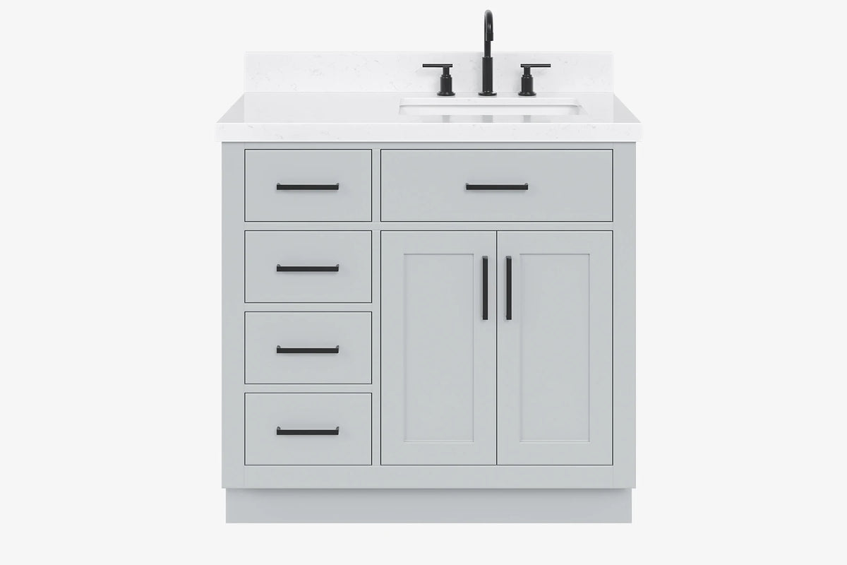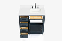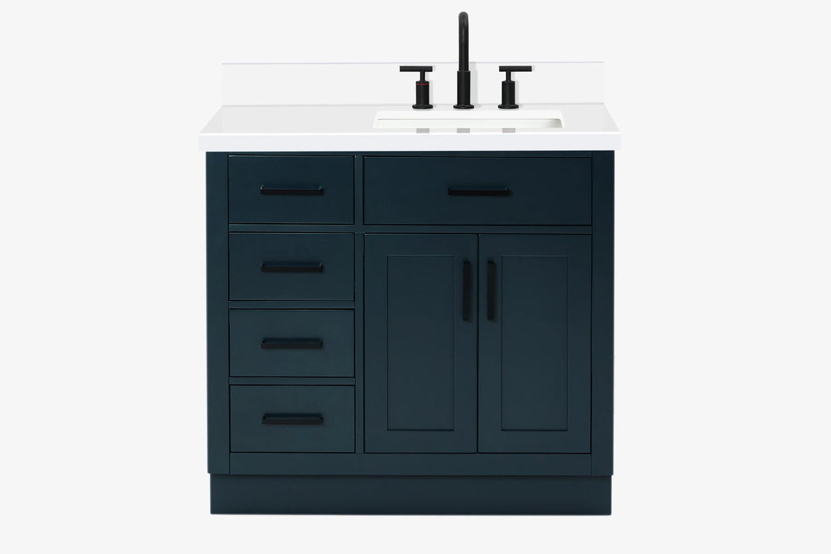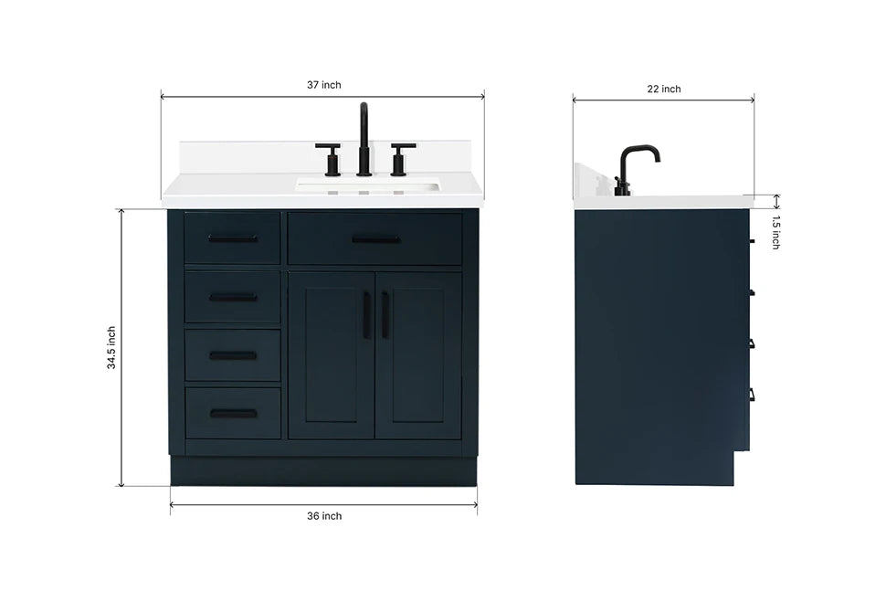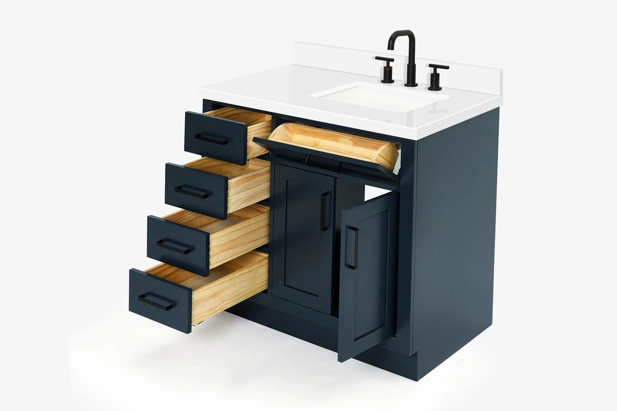 Hepburn collection from ARIEL Bath is the perfect combination of elegance and form, taking inspiration from traditional cabinetry with a modern twist. Constructed from high quality hardwood plywood with a tilt-down top drawer to keep smaller items conveniently at hand. This bathroom vanity with sink will be sure to last for many years to come. Cabinets are available in Grey, Midnight Blue, or White finishes, you can be sure to find the right color fit for your bathroom decor.