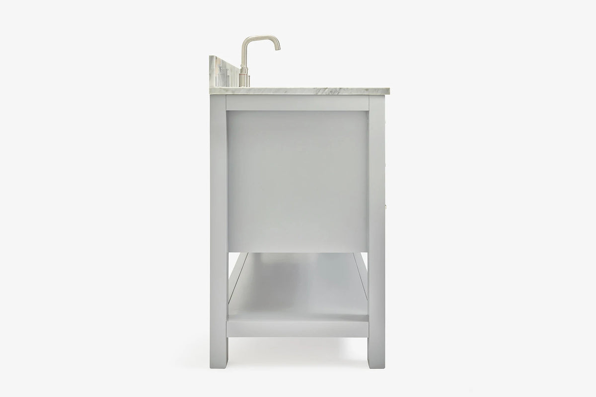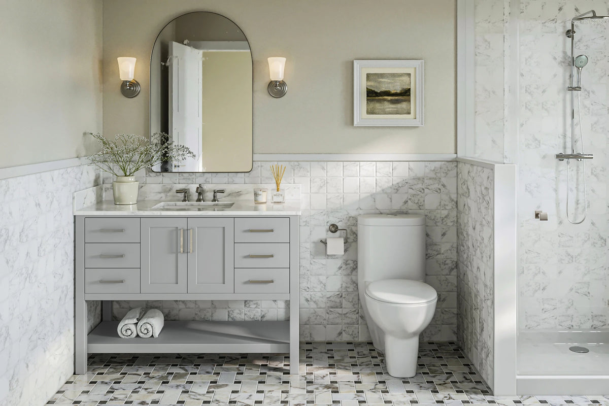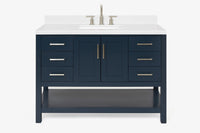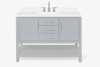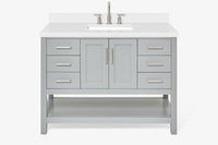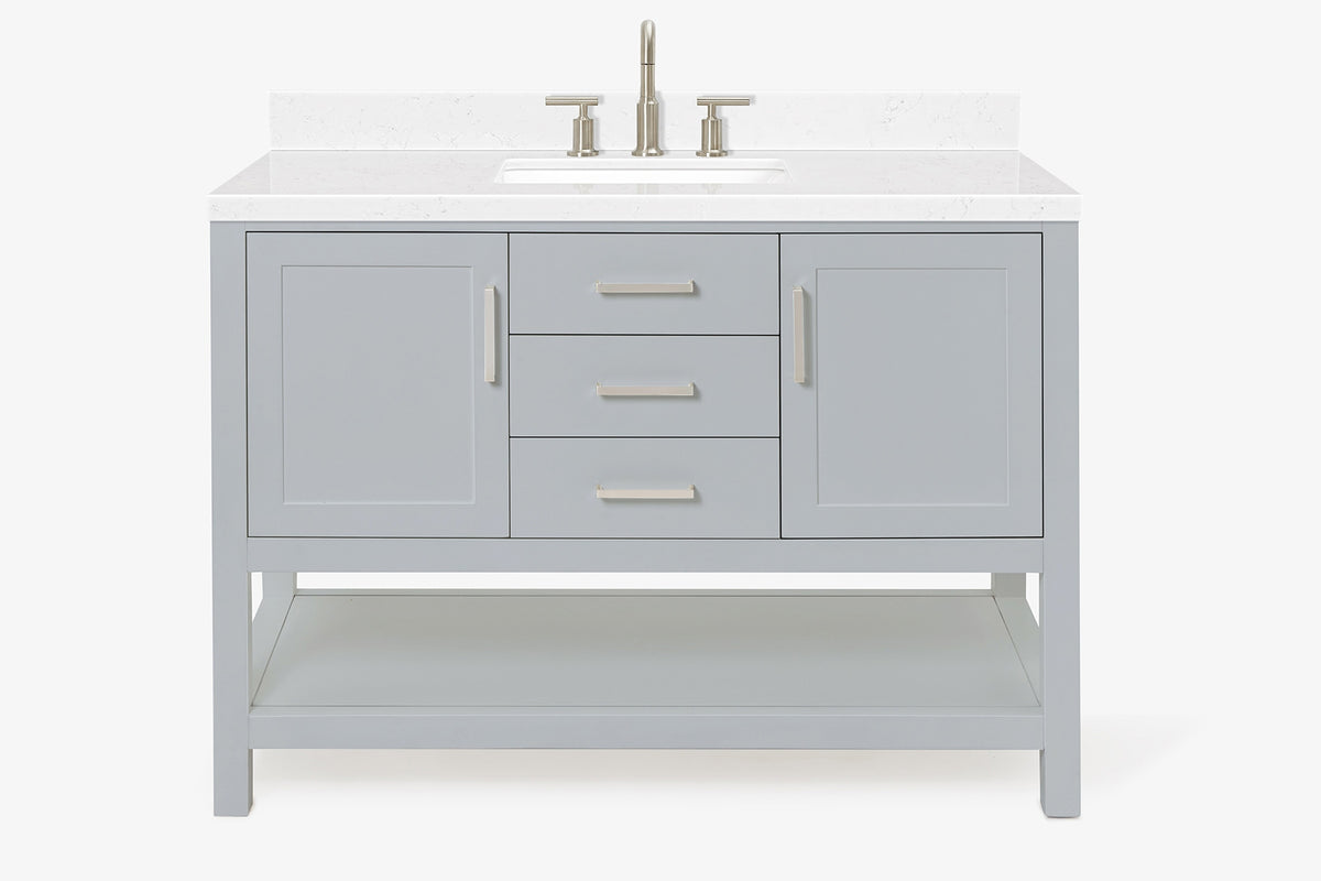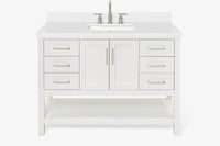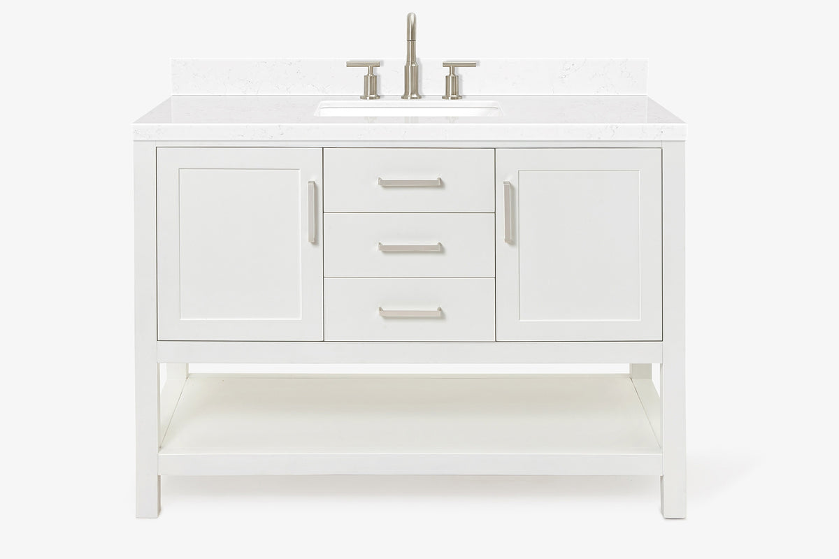 - Pure White Quartz countertop with 1.5″ thick miter edge. 4″ backsplash included.