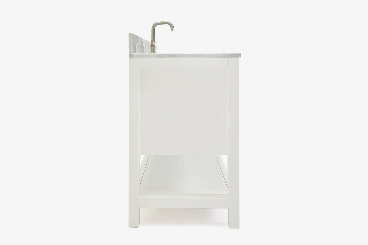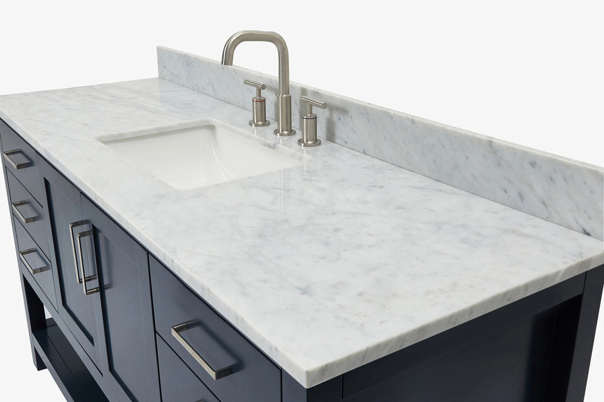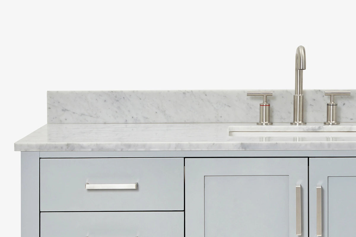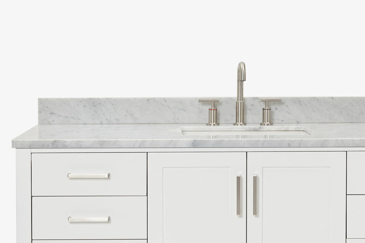 • Italian Carrara White Marble countertop with 0.75″ thick miter edge. 4″ backsplash included