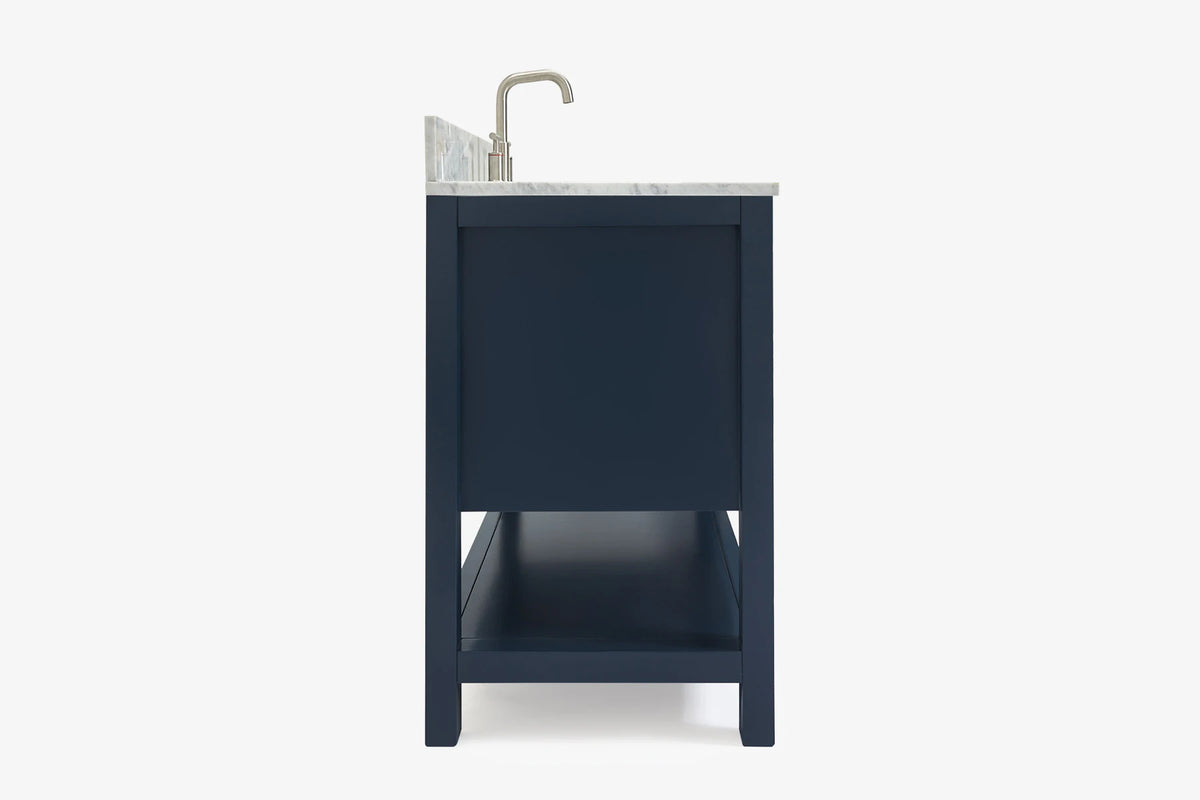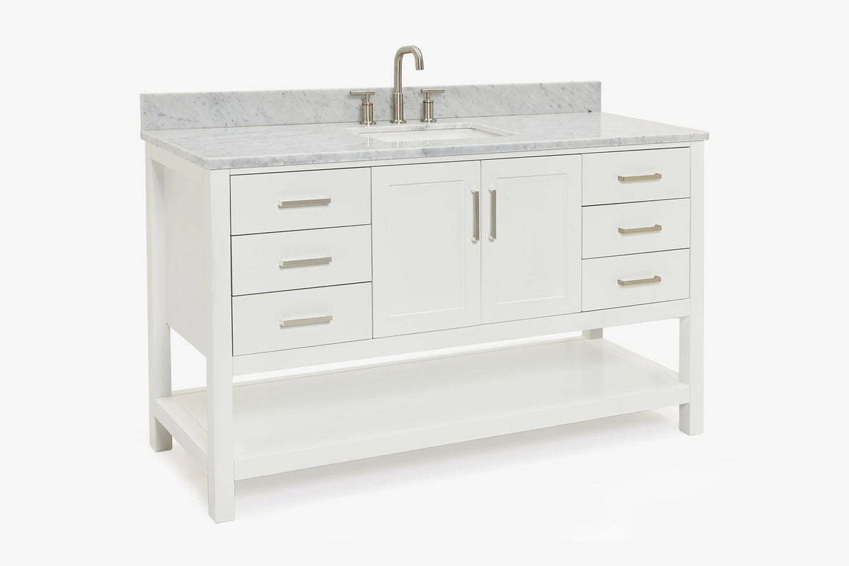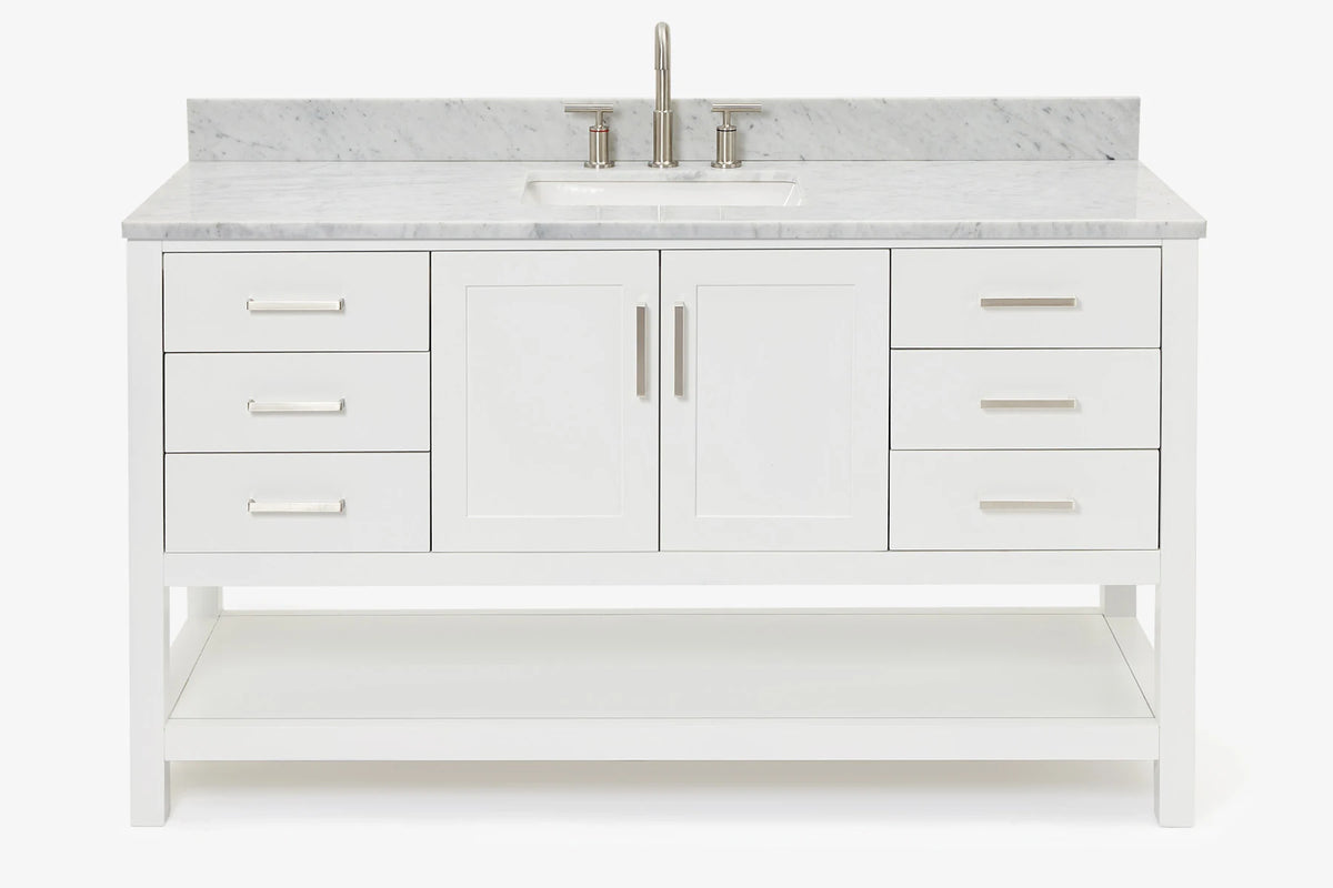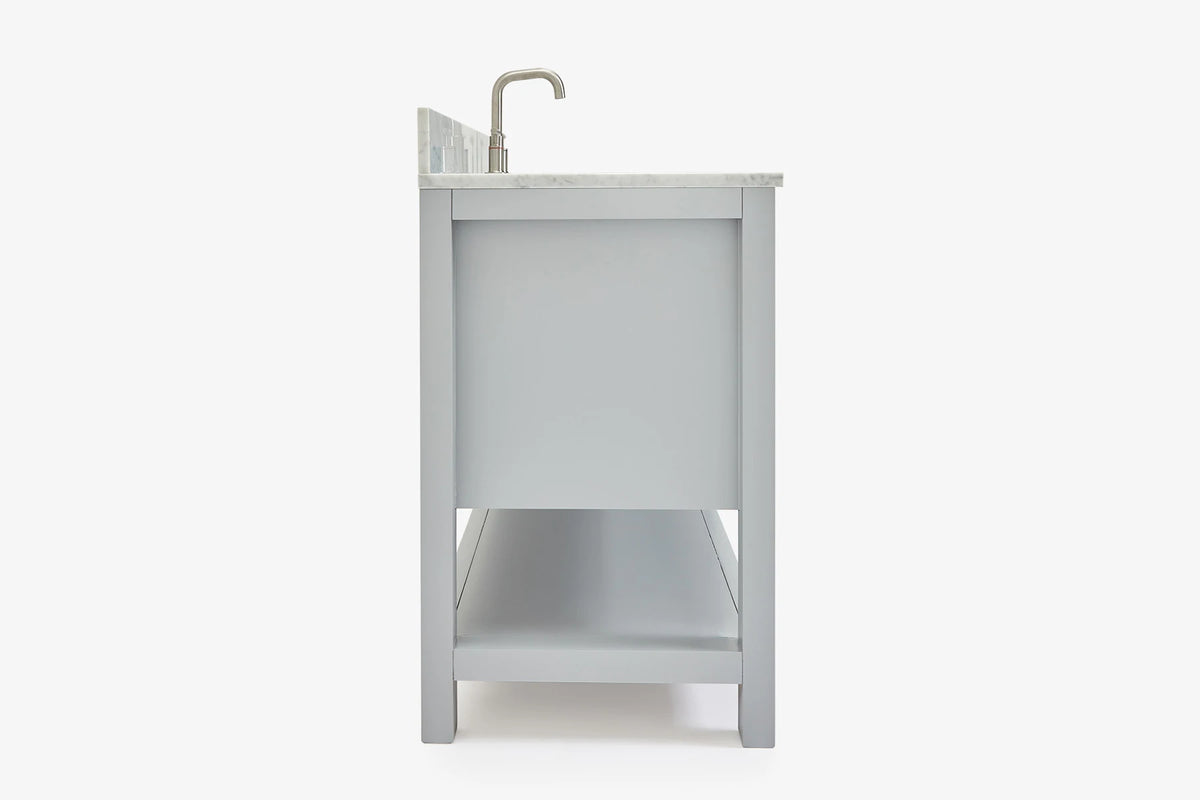 • Italian Carrara White Marble countertop with 0.75″ thick miter edge. 4″ backsplash included