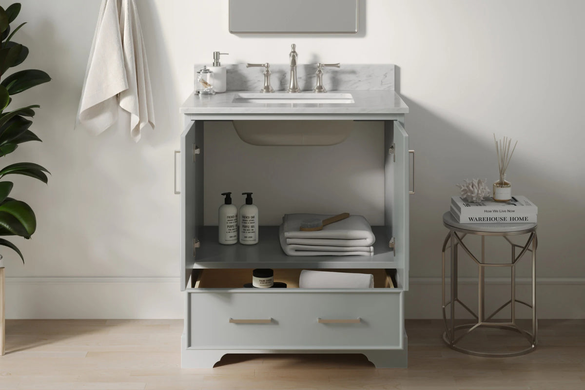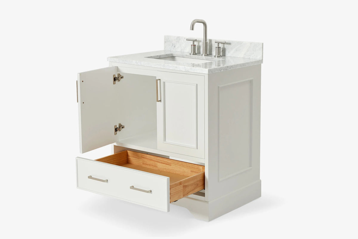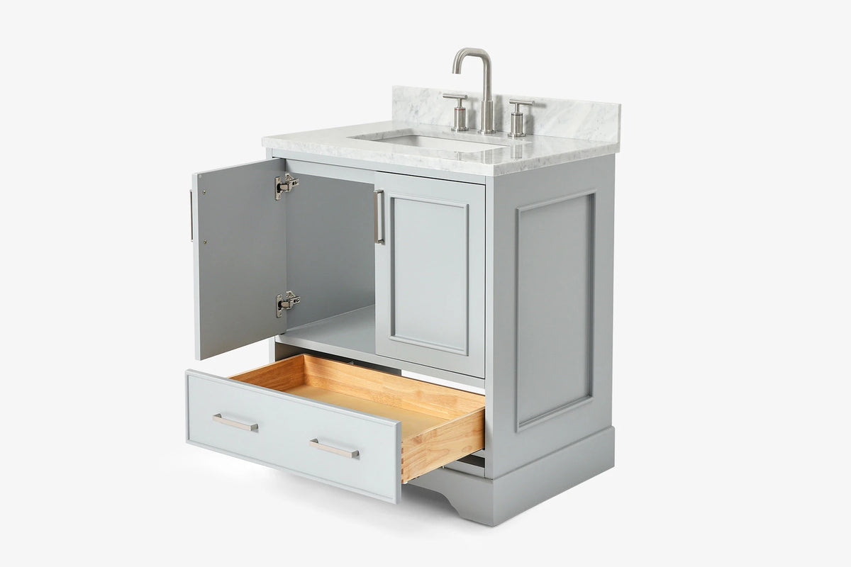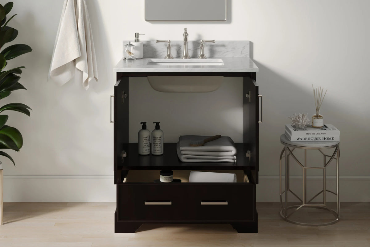 Stafford collection from ARIEL Bath will make bathroom look glamorous. Premium countertop with 4" backsplash , solid wood cabinets finished with quality details such as soft-close peace of mind, dovetail construction, brush nickle/ satin brass hardware and full extension glides. This Ariel bathroom vanity will ensure that your bathroom remains clutter-free. Various options for countertop, hardware, and cabinet color allow you to custom tailor your own bathroom remodeling