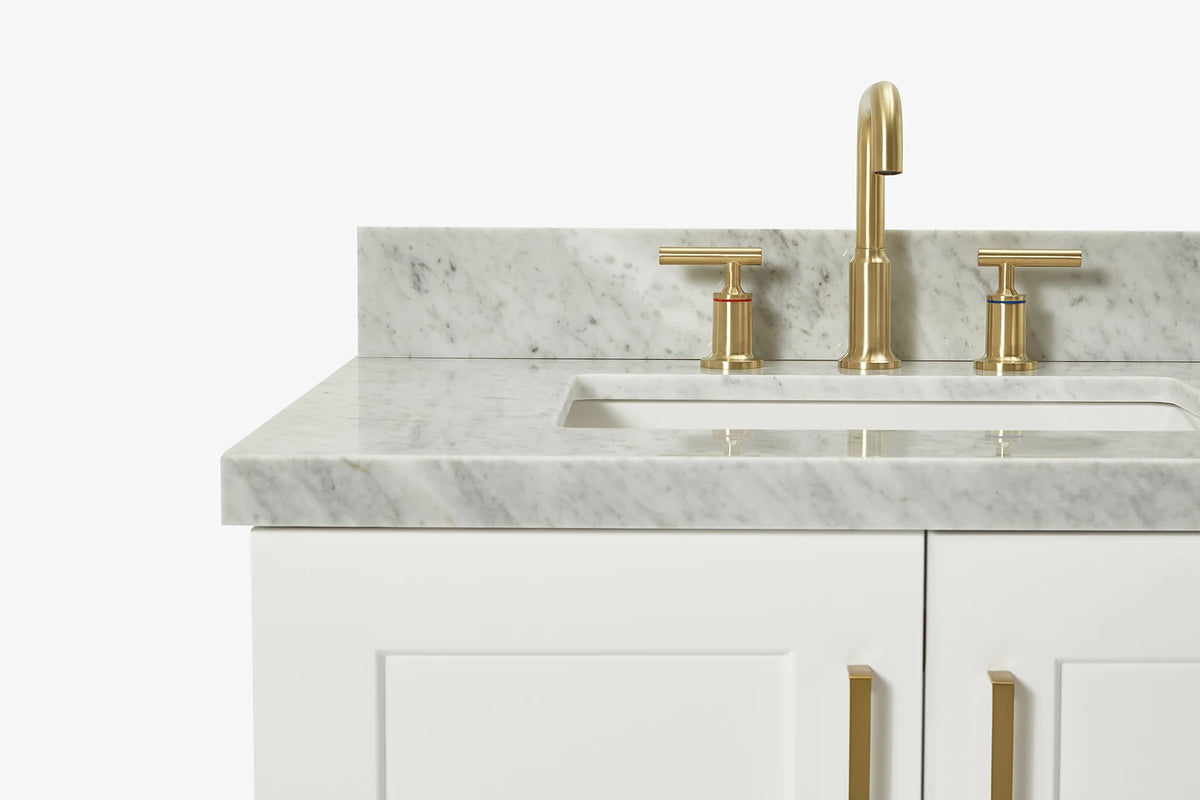 Taylor collection from ARIEL Bath is the perfect addition of style and flair for any bathroom while still remaining a truly timeless design. Featuring a hidden pull-out drawer behind each pair of cabinet doors, this Taylor bathroom vanity is truly the ideal combination of function and form. Premium Italian Carrara marble and white quartz matching 4in backsplash, soft-close dovetailed construction and hidden self-leveling feet add to the Taylor's appeal which is your perfect match for your own bathroom remodeling.