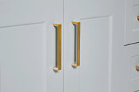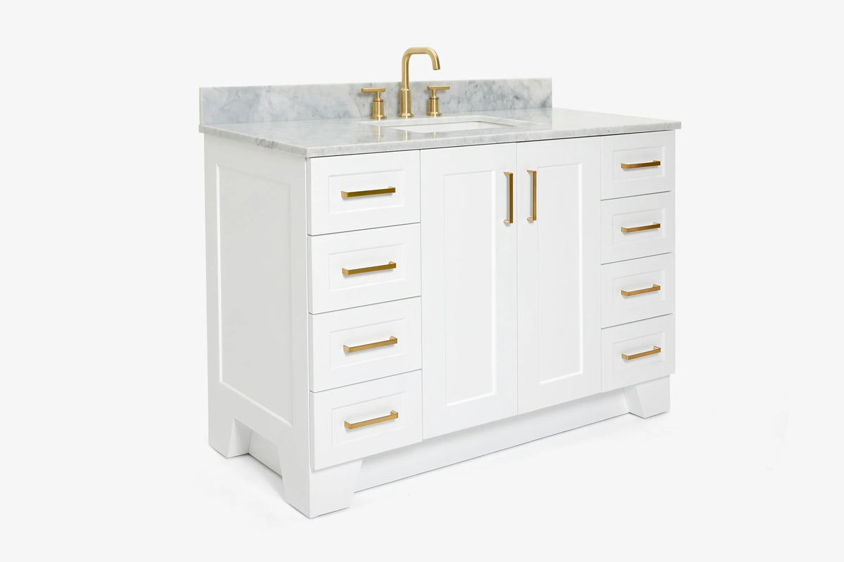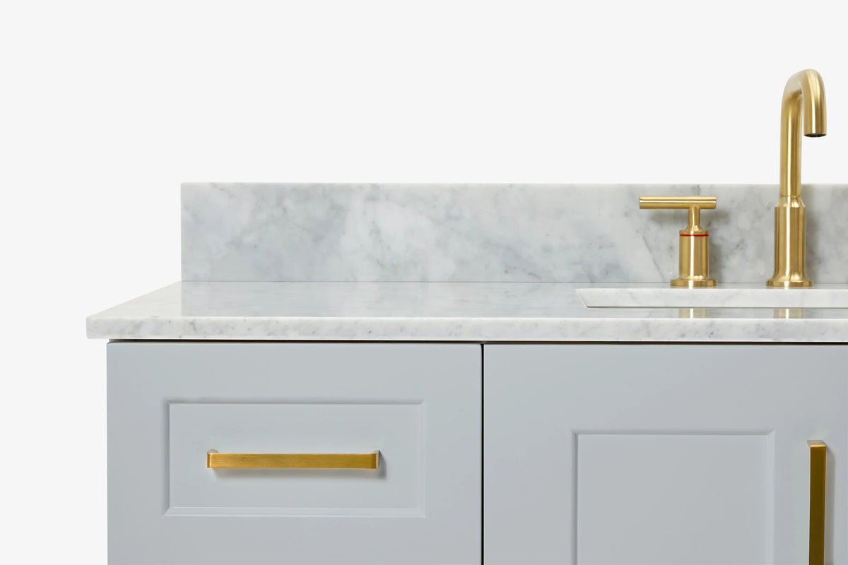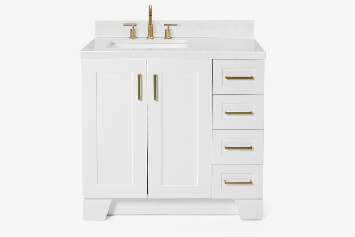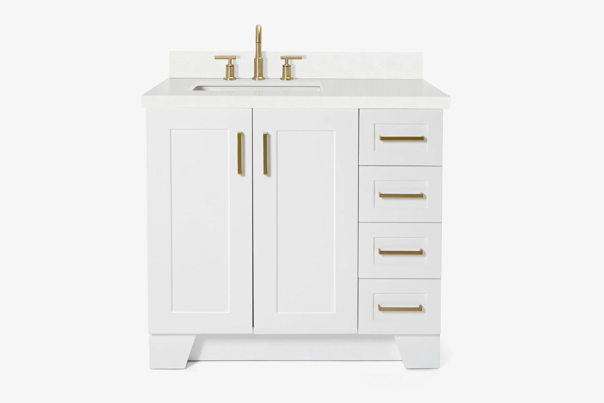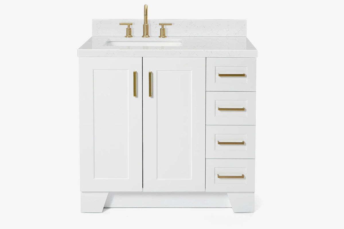 - Pure White Quartz countertop with 1.5″ thick miter edge. 4″ backsplash included.