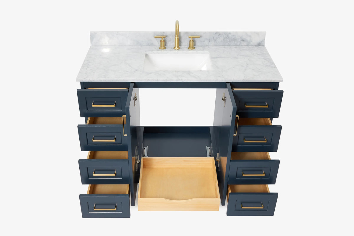 - Ample storage with 4 full extension drawers, 1 additional inside drawer and 2 soft-closing doors.