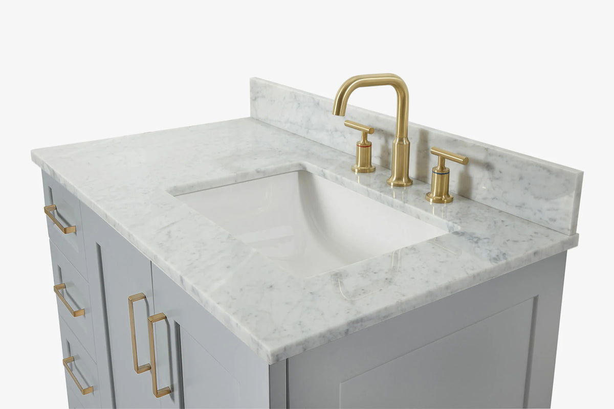 • Italian Carrara White Marble countertop with 0.75″ thick miter edge. 4″ backsplash included