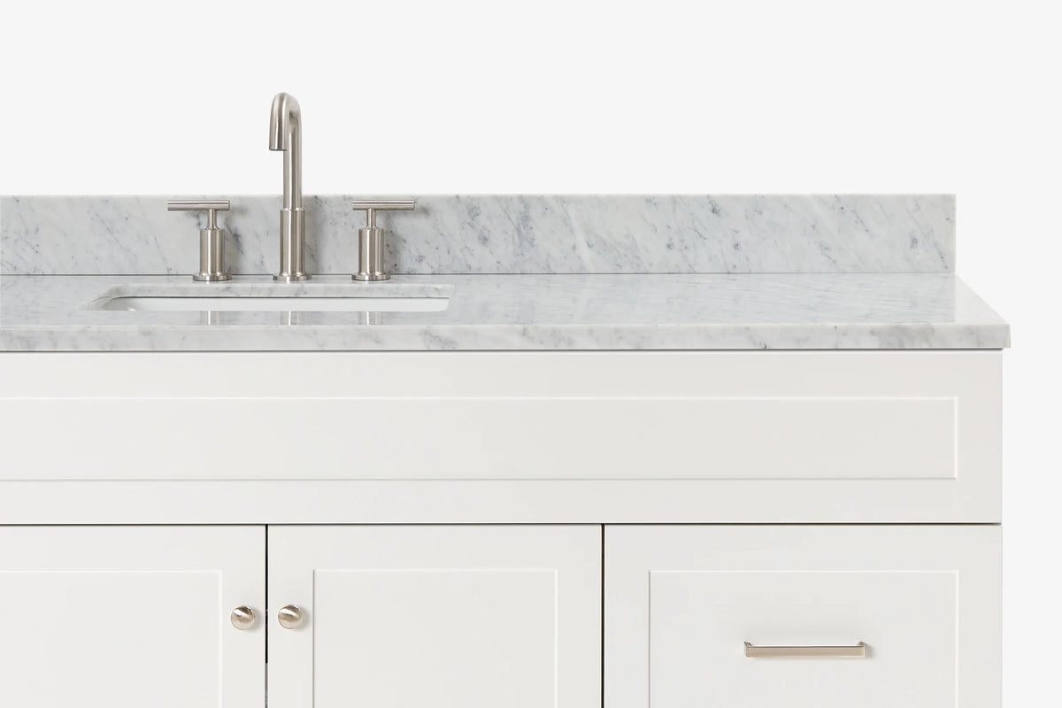 - Carrara White countertop with 0.75 in. edge and matching backsplash
