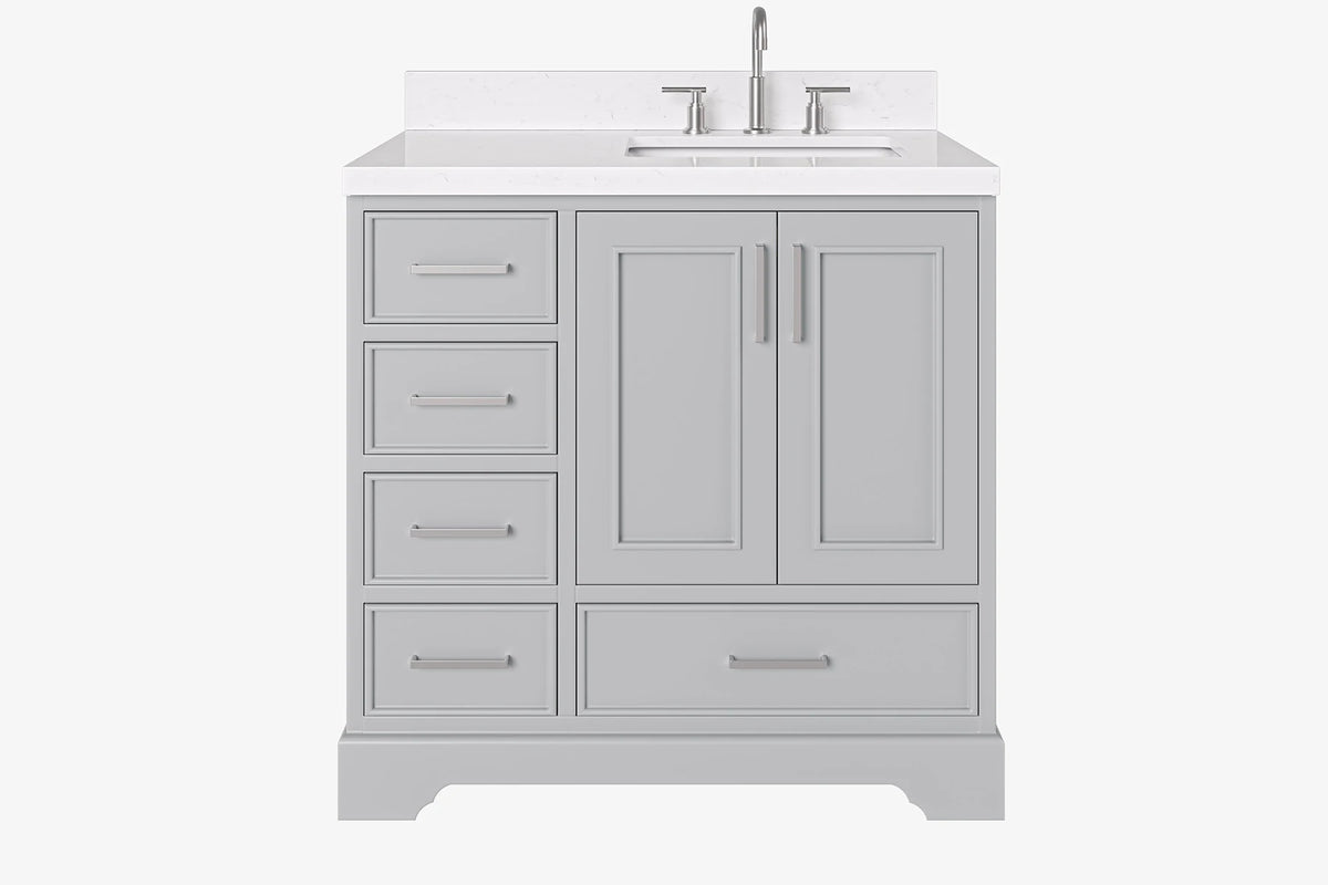 Stafford collection from ARIEL Bath will make bathroom look glamorous. Premium countertop with 4" backsplash , solid wood cabinets finished with quality details such as soft-close peace of mind, dovetail construction, brush nickle/ satin brass hardware and full extension glides. This Ariel bathroom vanity will ensure that your bathroom remains clutter-free. Various options for countertop, hardware, and cabinet color allow you to custom tailor your own bathroom remodeling
